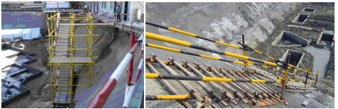 (8)深基坑施工應(yīng)設(shè)置扶梯、入坑踏步及專用載人設(shè)備或斜道等設(shè)施。采用斜道時,應(yīng)加設(shè)間距不大于400mm的防滑條等防滑措施。嚴禁沿坑壁、支撐或乘運土工具上下。