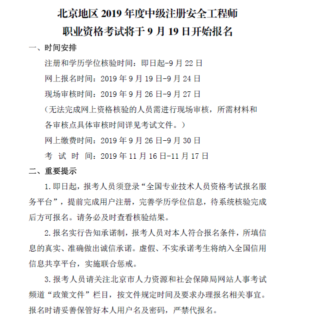 北京2019年度中級(jí)注冊(cè)安全工程師考試將于9月19日開(kāi)始報(bào)名