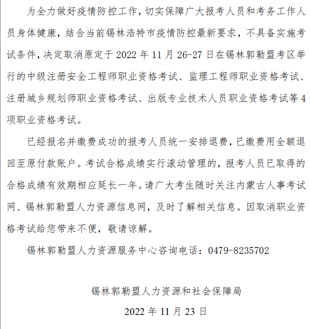 關(guān)于取消舉行2022年度全國注冊(cè)城鄉(xiāng)規(guī)劃師考試等4項(xiàng)資格考試錫林郭勒盟考區(qū)筆試工作的通告