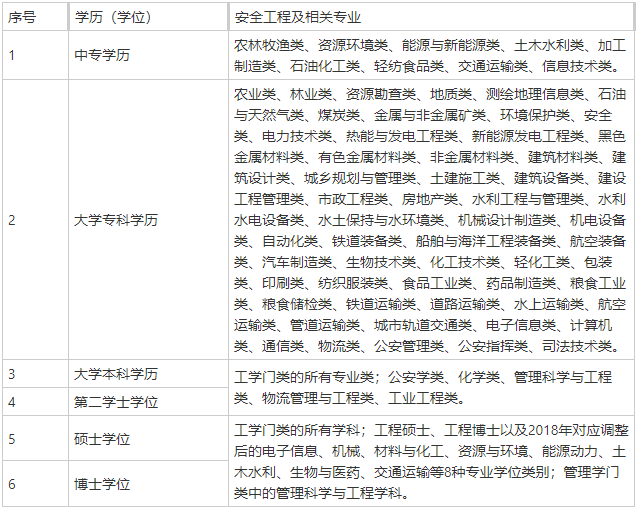 (一)具有安全工程及相關(guān)專業(yè)大學(xué)專科學(xué)歷,從事安全生產(chǎn)業(yè)務(wù)滿5年;或具有其他專業(yè)大學(xué)??茖W(xué)歷,從事安全生產(chǎn)業(yè)務(wù)滿6年。