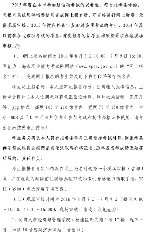 摘要:報名時間:2016年8月3日10:00~8月9日16:00;現(xiàn)場資格審核時間:2016年8月7日—8月9日(每天9:00-11:00,13:30-16:00);打印準考證:2016年10月12日10:00—10月13日16:00;考試時間:2016年10月15日、16日;繳費截止時間:2016年8月12日16:00。