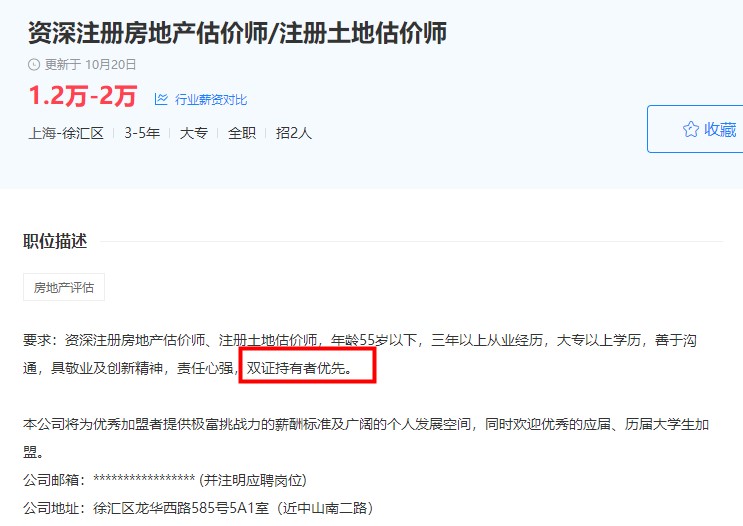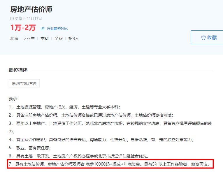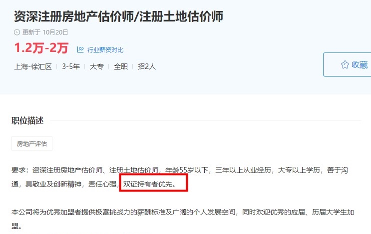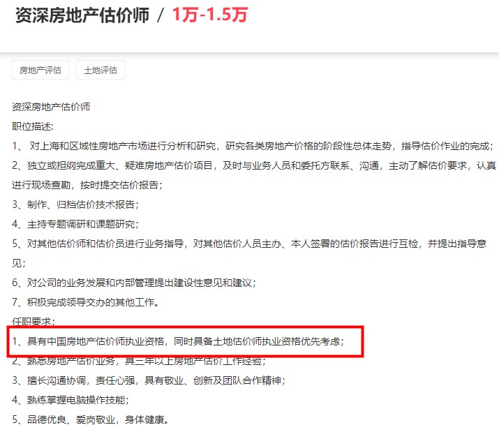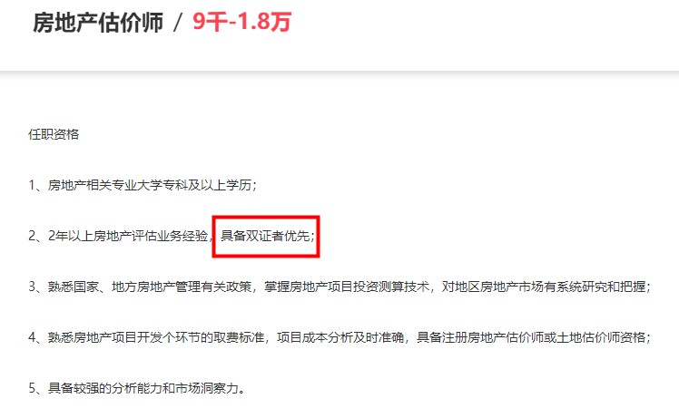 小編去某聯(lián)招聘中搜了一下工資較高的房地產(chǎn)估價師招聘要求,基本不約而同的要求具有房地產(chǎn)估價師證書或者土地估價師證書,其中很多公司說明持雙證者會優(yōu)先考慮,甚至有的公司對持雙證者會有額外的福利待遇。
