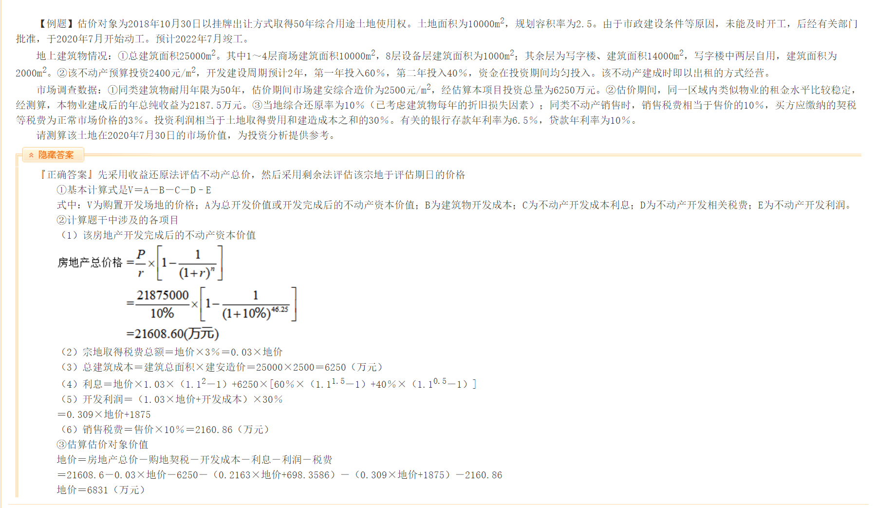 (4)經(jīng)調(diào)查,周邊區(qū)域同類型項(xiàng)目土地契稅為地價(jià)款的4%,銷售稅費(fèi)為售價(jià)的10%,投資利潤(rùn)率為30%,土地還原率為8%,綜合還原率為10%,銀行存款年利率為2%,貸款年利率為5%。