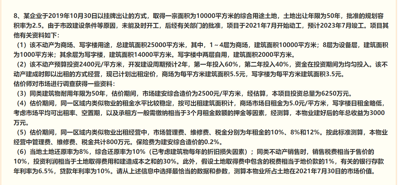 某企業(yè)于2020年10月以掛牌出讓的方式,取得一宗面積為10000m2的綜合用途土地,土地出讓年期為50年,批準(zhǔn)的規(guī)劃容積率為2.5。出讓合同中約定,當(dāng)土地使用權(quán)期限屆滿后無償收回土地使用權(quán)及地上建筑物。由于市政建設(shè)條件等原因,未能及時(shí)開工,后經(jīng)有關(guān)部門批準(zhǔn),項(xiàng)目于2022年7月30日開始動(dòng)工,預(yù)計(jì)2024年7月30日竣工。估價(jià)師經(jīng)過對(duì)該宗地及周圍區(qū)域調(diào)查,搜集了如下相關(guān)數(shù)據(jù)資料: