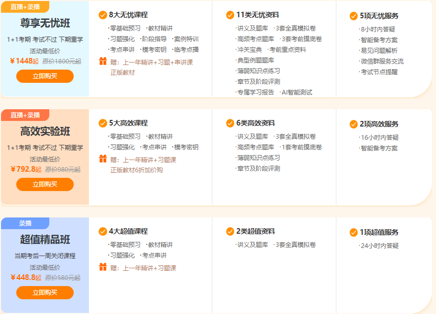 1、8大無憂課程+11類無憂資料+5項無憂服務+贈上一年精講、習題、串講課和正版教材(包郵),針對較難的案例分析科目增加專項訓練課程