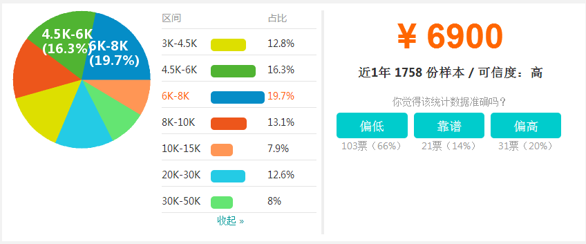 考過的同學最關注的無非是證書能帶來的直接效益,升職加薪是每個房估人想要達到的直接效果,但是目前市場上房地產(chǎn)估價師行業(yè)的薪資怎么樣,我們一起來扒一扒。根據(jù)職友集網(wǎng)站招聘信息來看,平均薪資在6K-8K的人數(shù)居多,占到19.7%。其次是4.5K-6K,占到16.3%。以下數(shù)據(jù)可以直觀的看出薪資占比。