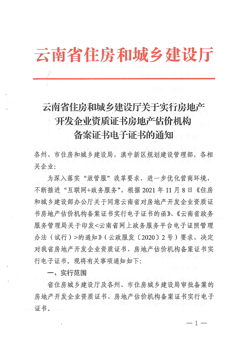 云南省房地產(chǎn)估價(jià)機(jī)構(gòu)備案證書電子證書的通知