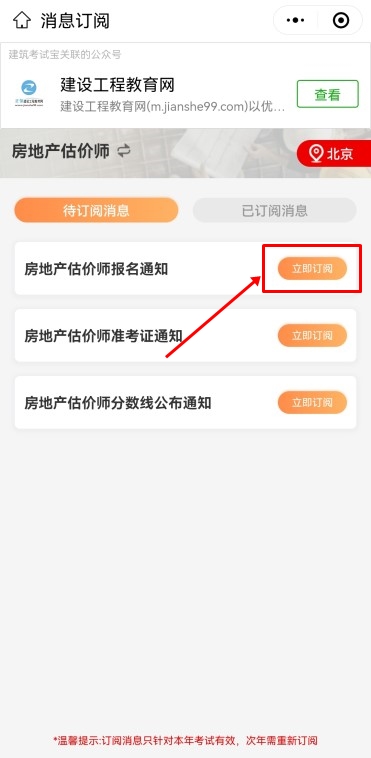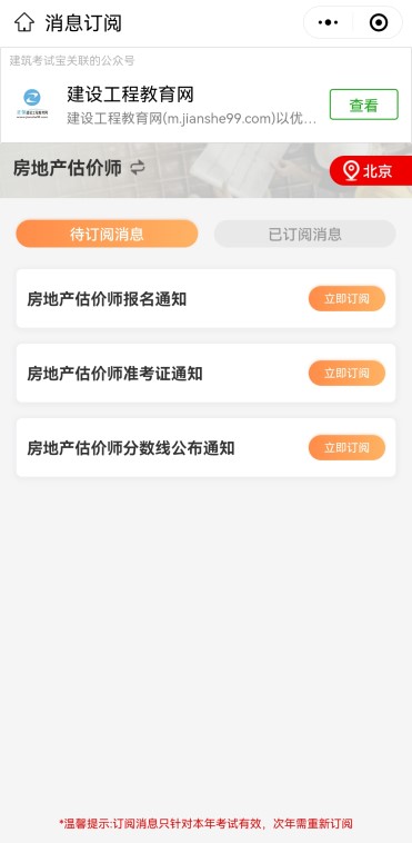 預(yù)約小程序房地產(chǎn)估價師報名提醒步驟很簡單,只需兩步,即可訂閱2022年房地產(chǎn)估價師考試報名時間通知提醒!
