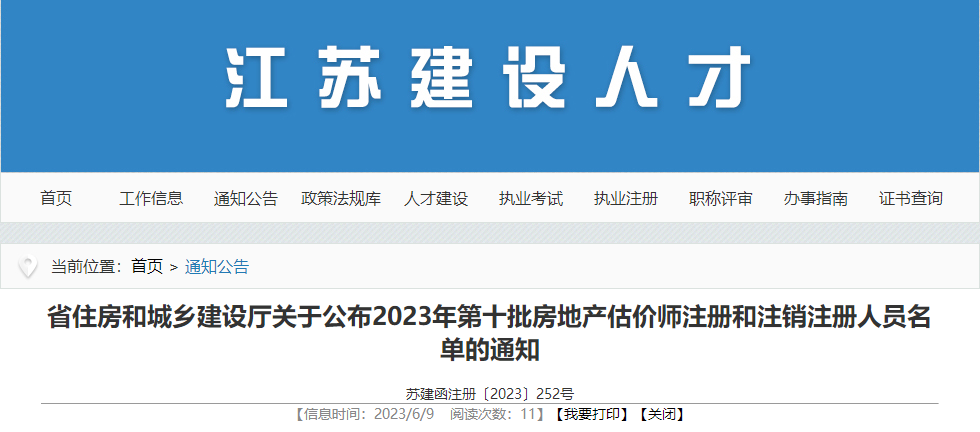 江蘇省住建廳關于公布2023年第十批房地產(chǎn)估價師注冊和注銷注冊人員名單的通知