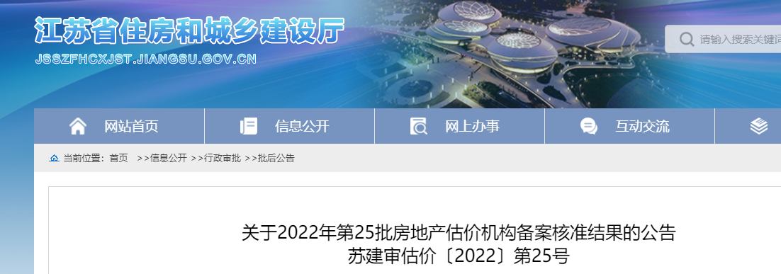 江蘇省?關(guān)于2022年第25批房地產(chǎn)估價機構(gòu)備案核準(zhǔn)結(jié)果的公告