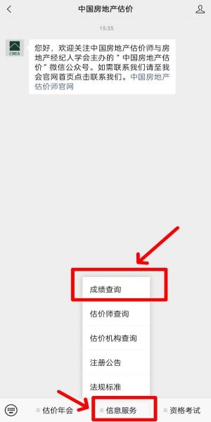 2、微信查詢:關(guān)注“中國(guó)房地產(chǎn)估價(jià)”微信公眾號(hào)(微信號(hào):CIREA-WX),點(diǎn)擊“信息服務(wù)”欄目下的“成績(jī)查詢”。