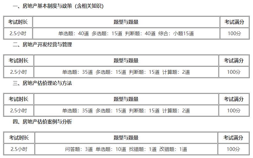 其中,房地產(chǎn)基本制度與政策(含相關(guān)知識)有單選:40道、多選:15道、判斷:40道、綜合:小題15道;房地產(chǎn)開發(fā)經(jīng)營與管理有單選:35道、多選:15道、判斷:15道、計(jì)算:2道;房地產(chǎn)估價(jià)理論與方法有單選:35道、多選:15道、判斷:15道、計(jì)算:2道;房地產(chǎn)估價(jià)案例與分析有問答:3道、單選:10道、找錯(cuò):1道、改錯(cuò):1道。