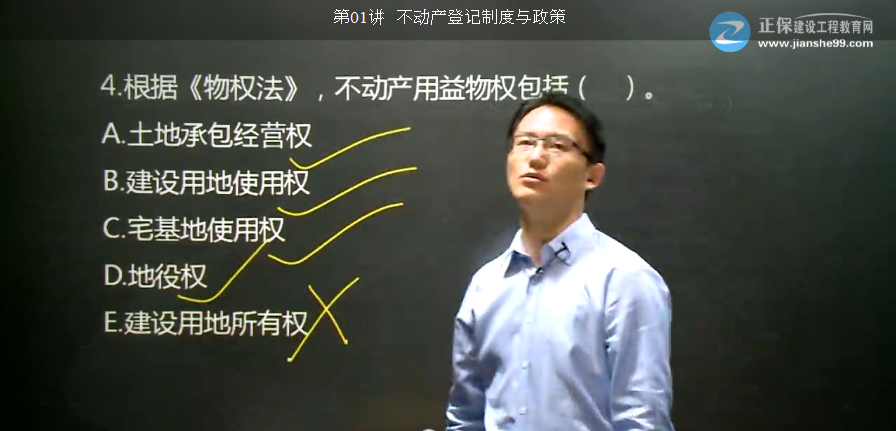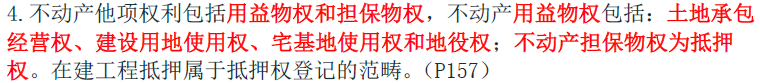 【解析】本題考查的是不動產(chǎn)登記的類型。根據(jù)《物權(quán)法》,不動產(chǎn)用益物權(quán)包括:土地承包經(jīng)營權(quán)、建設(shè)用地使用權(quán)、宅基地使用權(quán)和地役權(quán)。參見教材P157。