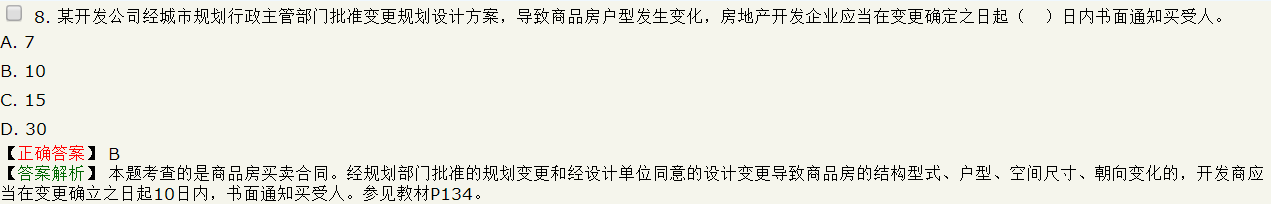 【解析】本題考查的是商品房買賣合同。經(jīng)規(guī)劃部門批準(zhǔn)的規(guī)劃變更、設(shè)計(jì)單位同意的設(shè)計(jì)變更導(dǎo)致商品房的結(jié)構(gòu)形式、戶型、空間尺寸、朝向、供熱、采暖等方式變化,以及出現(xiàn)合同當(dāng)事人約定的其他影響商品房質(zhì)量或使用功能情形的,房地產(chǎn)開發(fā)企業(yè)應(yīng)當(dāng)在變更確立之日起10日內(nèi),書面通知買受人。參見(jiàn)教材P134。