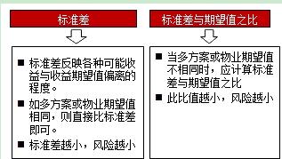 第四步,如兩物業(yè)期望值不同,需計(jì)算標(biāo)準(zhǔn)差與期望值之比,該比值小的那個(gè)風(fēng)險(xiǎn)小