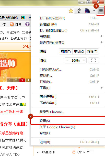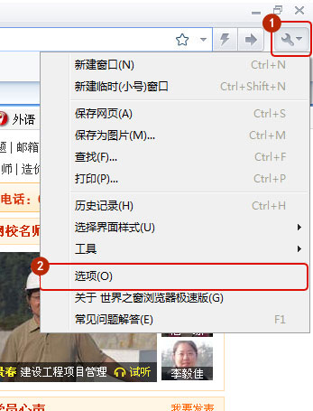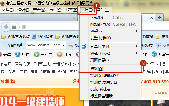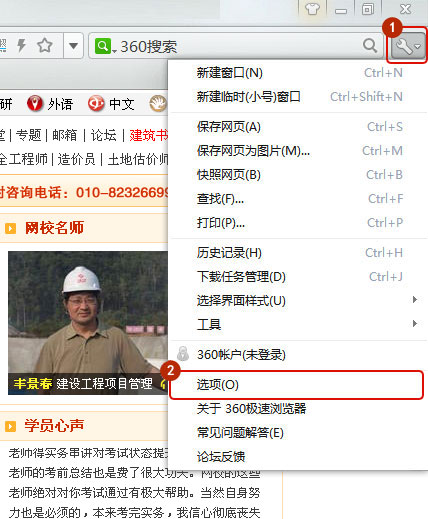 打開瀏覽器,先登錄到建設(shè)工程教育網(wǎng)的頁面(這步很重要),點擊右上角小扳手-選項,如圖所示: