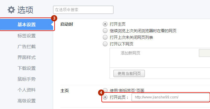 選擇基本設(shè)置,在主頁設(shè)置里輸入網(wǎng)址。