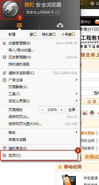 打開獵豹瀏覽器輸入并訪問 m.mm34228.com后,點擊左上角豹頭>>選項。