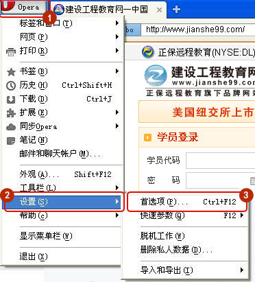 打開opera瀏覽器-左上角菜單-設(shè)置-首選項,如圖所示: