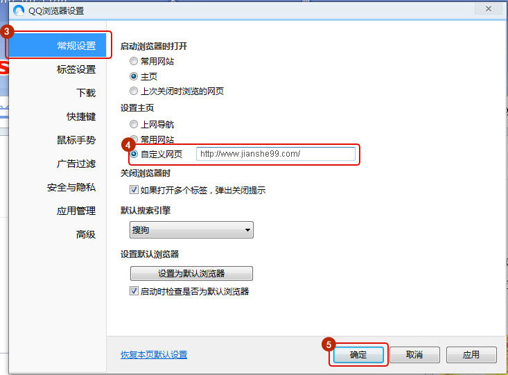 選擇常規(guī)設(shè)置選項,勾選自定義網(wǎng)址,并輸入m.mm34228.com點擊保存,就設(shè)定建設(shè)工程教育網(wǎng)為主頁。