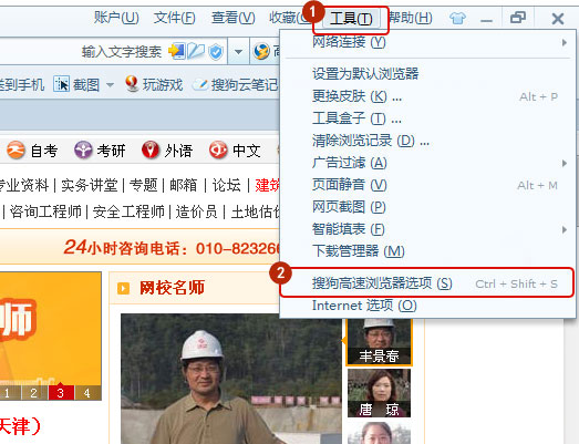打開搜狗瀏覽器,點擊菜單里的工具 - 搜狗高速瀏覽器選項,如圖所示: