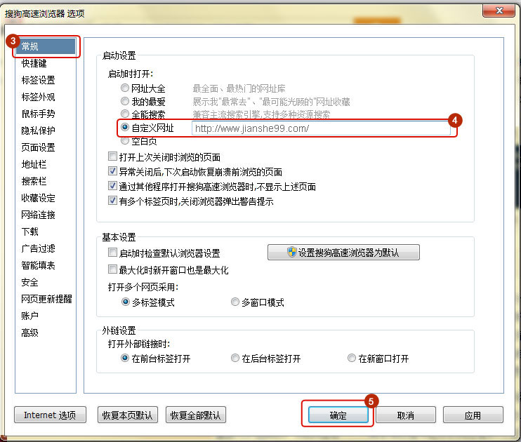 選擇常規(guī)選項, 在啟動設(shè)置里選擇自定義網(wǎng)址,并輸入m.mm34228.com,點擊確定。