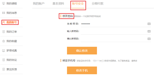 以學(xué)員代碼及密碼登錄成功之后進(jìn)入我的網(wǎng)校我的家,點(diǎn)擊左側(cè)“我的賬號”,選擇“賬號安全”,您可在“修改密碼”中修改您的密碼。
