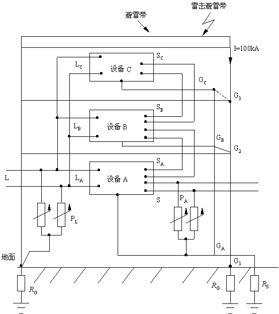 2.1 圖3是建筑物受直擊雷后室內(nèi)設(shè)備受損壞的示意圖,圖中A、B、C是處在不同樓層的電子設(shè)備;SA、SB、SC為各設(shè)備之間互相通信的信號線;S是與建筑物外的設(shè)備通信信號線;G1、G2、G3為不同樓層建筑物內(nèi)部鋼筋引下線;L、LA、LB、LC為設(shè)備供電線路;RS為設(shè)備工作接地,RG為建筑物防雷接地,GA、GB、GC為設(shè)備工作接地在主桿線上的接地點;PL、PS分別為電源避雷器和信號避雷器。