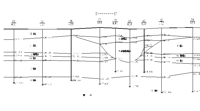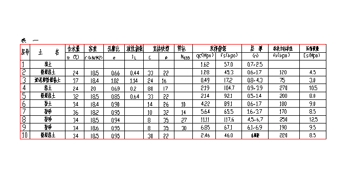 宿舍樓位于某學院新校區(qū)西北角,總建筑面積17138平方米,4幢宿舍樓為六層磚混,層高3.2m,平行布置,勘察揭示有暗河道南北蜿蜒橫穿見圖一,典型地質剖面見圖二,土性特征見表一。場地好土區(qū)土質良好,地基承載力高,暗河道區(qū)土性差異較大,分布復雜,另建筑平面布置未考慮設沉降縫,這給基礎設計帶來很大困難。