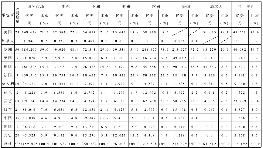 表3 2000年全球225家最大承包公司營業(yè)額的市場分布 單位:億美元
