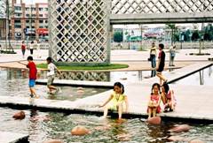 玩水是人性根深蒂固的一種。水空間的多樣性和可戲性是本廣場(chǎng)設(shè)計(jì)的一個(gè)主要特 色、分割廣場(chǎng)的三條灌渠,水流湍急,波濤洶涌,只可觀不可親不可玩。見如此好水只穿流而過,當(dāng)?shù)厝撕驮O(shè)計(jì)者都感可惜。所以,設(shè)計(jì)之初的一個(gè)重要設(shè)想是引河渠之水八廣場(chǎng),使人觸手可及。