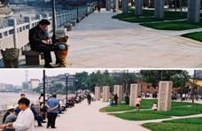 II區(qū)以水景和平地廣場(chǎng)為主。清晨和傍晚常有大量的群眾性體育活動(dòng)開展。與對(duì)岸I區(qū)的濱河休閑走廊相呼應(yīng),設(shè)大量石條凳,以供休憩、觀景。