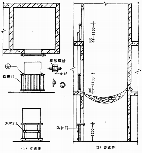 二、 電梯井口必須設(shè)防護(hù)欄桿或固定柵門;電梯井內(nèi)應(yīng)每隔兩層并最多隔10m設(shè)一道安全網(wǎng)。