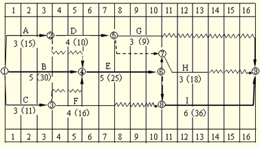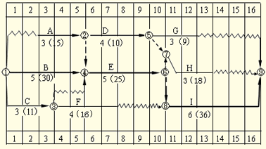 某工程項目業(yè)主通過工程量清單招標確定某承包商為該項目中標人,并簽訂了工程合同,工期為16天。該承包商編制的初始網(wǎng)絡(luò)進度計劃(每天按一個工作班安排作業(yè))如圖6-1所示,圖中箭線上方字母為工作名稱,箭線下方括號外數(shù)字為持續(xù)時間,括號內(nèi)數(shù)字為總用工日數(shù)(人工工資標準均為45.00元/工日,窩工補償標準均為30.00元/工日)。由于施工工藝和組織的要求,工作A、D、H需使用同一臺施工機械(該種施工機械運轉(zhuǎn)臺班費800元/臺班,閑置臺班費550元/臺班),工作B、E、I需使用同一臺施工機械(該種施工機械運轉(zhuǎn)臺班費600元/臺班,閑置臺班費400元/臺班),工作C、E需由同一班組工人完成作業(yè),為此,該計劃需做出相應(yīng)的調(diào)整。