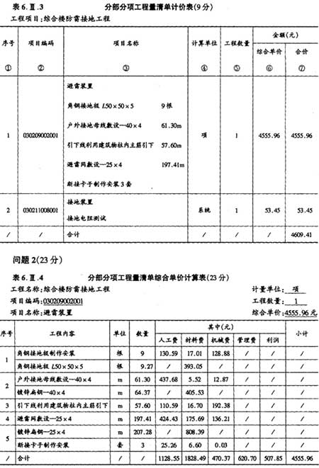 2.依據(jù)上述相關(guān)費(fèi)用數(shù)據(jù)計(jì)算避雷裝置項(xiàng)目的工程量清單綜合單價(jià),并分別填入答題紙表6.111.4“分部分項(xiàng)工程量清單綜合單價(jià)計(jì)算 表”和答題紙表6.11.3“分部分項(xiàng)工程量清單計(jì)價(jià)表”中的第6、7項(xiàng)。(計(jì)算結(jié)果均保留兩位小數(shù))。