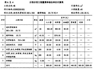 2.假設(shè)矩形風(fēng)管500×300的工程量為40m2時(shí),依據(jù)《建設(shè)工程工程量清單計(jì)范》的規(guī)定,計(jì)算矩形風(fēng)管500× 300的工程量清單綜合單價(jià),將相關(guān)數(shù)據(jù)內(nèi)容填入答表6.Ⅱ。4中,并在答題紙表6.Ⅱ.4下面列式計(jì)算所列項(xiàng)目的工程量或耗用量。