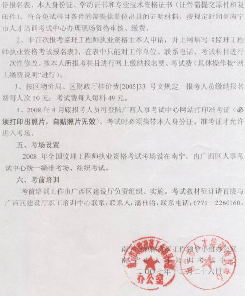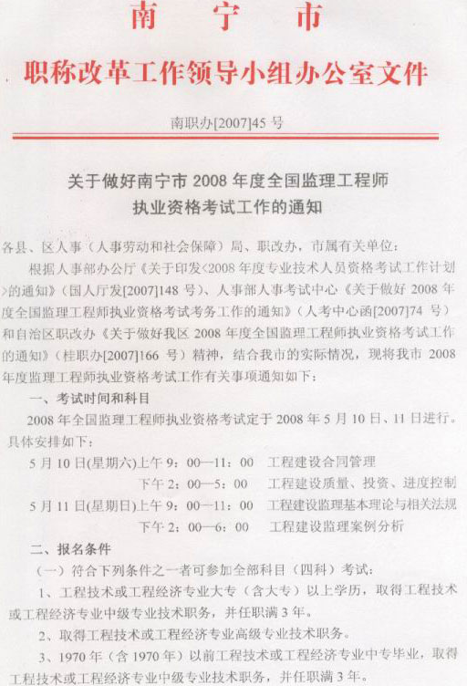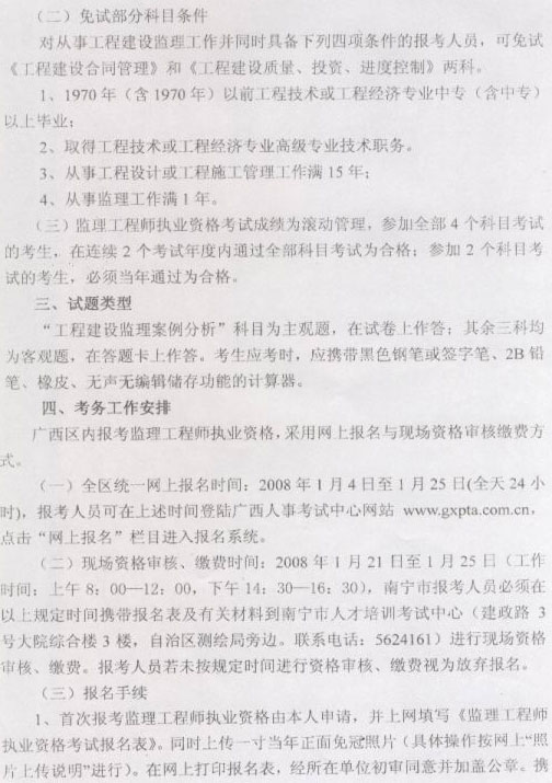 [南寧]2008年度全國監(jiān)理工程師執(zhí)業(yè)資格考試08年1月4日至25日?qǐng)?bào)名