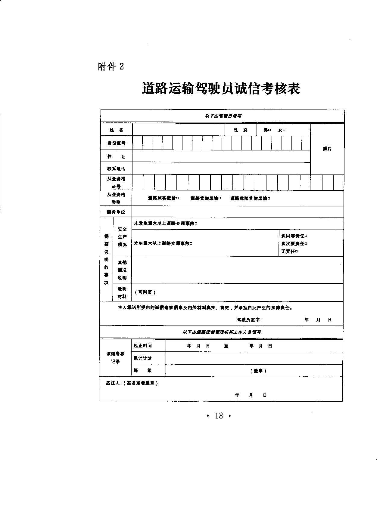 。ㄎ澹兜缆愤\(yùn)輸駕駛員誠(chéng)信考核表》(式樣見(jiàn)附件2)。