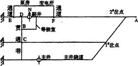 ?、僭谥?、副井貫通巷和主井繞道采用壓入式通風(fēng)(3分),在主井井筒內(nèi)再安一趟風(fēng)筒(1分),采用抽出式通風(fēng)(1分)。優(yōu)點是井筒空氣相對清潔,缺點是需多增加一趟風(fēng)筒(2分)。