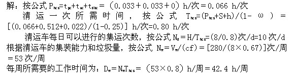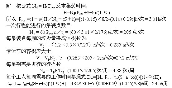 14、某住宅區(qū)共有1000戶居民,由2個(gè)工人負(fù)責(zé)清運(yùn)該區(qū)垃圾。試按固定式清運(yùn)方式,計(jì)算每個(gè)工人清運(yùn)時(shí)間及清運(yùn)車容積,已知條件如下:每一集裝點(diǎn)平均服務(wù)人數(shù)3.5人;垃圾單位產(chǎn)量1.2kg/(d/人);容器內(nèi)垃圾的容重120kg/m3;每個(gè)集裝點(diǎn)設(shè)0.12m3的容器二個(gè);收集頻率每周一次;收集車壓縮比為2;來回運(yùn)距24km;每天工作8小時(shí),每次行程2次;卸車時(shí)間0.10h/次;運(yùn)輸時(shí)間0.29h/次;每個(gè)集裝點(diǎn)需要的人工集裝時(shí)間為1.76分/點(diǎn)/人);非生產(chǎn)時(shí)間占15%。