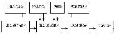 從車間出來的各種類型的廢水在同一調(diào)節(jié)池進行混合調(diào)節(jié),然后泵入反應(yīng)池,加入稀釋或固體的NMSTA天然礦物污水治理劑(藥劑本身具有還原六價鉻和破氰作用,一般濃度低的鉻水不需再加還原劑)反應(yīng),加入BC礦粉(一部分起中和作用,可以節(jié)約大部分的堿,另外有去除重金屬的作用)反應(yīng),可將廢水的pH調(diào)節(jié)到5~6,該階段一般要求不少于20min,用堿將廢水的pH調(diào)節(jié)到8.5~9,同時加入漂白水等氧化劑破氰,最后經(jīng)沉淀池沉淀后排放。