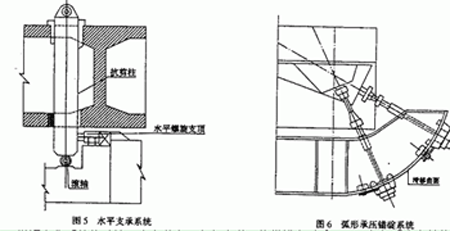d.如圖5所示,水平支承系統(tǒng)由抗剪柱、水平螺旋支頂及滾軸等組成,其垂直穿入箱梁的預(yù)留孔中,以抵抗?fàn)克鳟a(chǎn)生的水平分力。