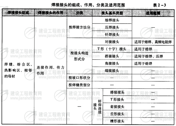 焊接接頭組成、作用、分類及適用范圍(表2-3)。