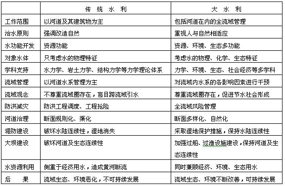 按照大水利的理論,流域規(guī)劃要全面地考慮流域的水文、自然和社會特征,即“天時”、“地利”、“人和”,以謀求流域內(nèi)社會的可持續(xù)發(fā)展為規(guī)劃目標(biāo)。我在過去提出的大水利理論中曾經(jīng)對新舊水利理論的差異列表進(jìn)行了比較(表2),這張表有助于我們較好地理解它們本質(zhì)上的差別。