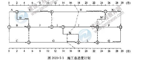 【2020年】(試題五)某工程,建設(shè)單位與施工單位按照《建設(shè)工程施工合同(示范文本)》簽訂了施工合同。經(jīng)總監(jiān)理工程師審核確認的施工總進度計劃如圖2020-5-1所示,各項工作均按最早開始時間安排且勻速施工。