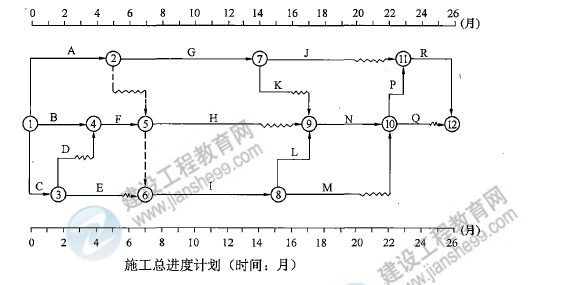 【2018年】(試題五)某工程,建設(shè)單位與施工單位按照《建設(shè)工程施工合同(示范文本)》簽訂了施工合同。經(jīng)總監(jiān)理工程師批準(zhǔn)的施工總進(jìn)度計(jì)劃如圖5-1所示(時(shí)間:月),各工作均按最早開(kāi)始時(shí)間安排且勻速施工。