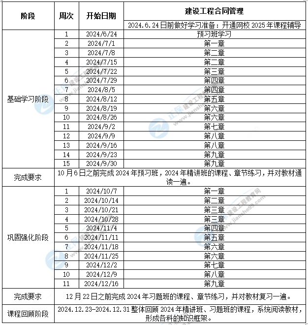 1、整體進(jìn)度說(shuō)明:本計(jì)劃表從2025年1月1日開(kāi)始執(zhí)行,計(jì)劃于2025年5月16日結(jié)束,共計(jì)19周;其中:基礎(chǔ)學(xué)習(xí)階段安排12周,鞏固強(qiáng)化階段安排6周,考前調(diào)整階段安排1周。學(xué)員可根據(jù)本表的提示,結(jié)合自己的工作,學(xué)習(xí)情況進(jìn)行細(xì)化,并按網(wǎng)校要求完成聽(tīng)課、做題的學(xué)習(xí)任務(wù),基本可滿(mǎn)足考試需要。