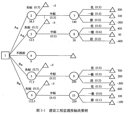 工程監(jiān)理單位根據過去承擔過的類似工程數據進行分析,得到每種方案的利潤和出現概率見表5-6。如果投標未果,則會損失5萬元(投標準備費)。