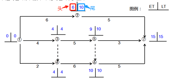 如下所示雙代號(hào)網(wǎng)絡(luò)計(jì)劃,每個(gè)節(jié)點(diǎn)上方標(biāo)注兩個(gè)時(shí)間,一個(gè)是節(jié)點(diǎn)的最早時(shí)間,另外一個(gè)是節(jié)點(diǎn)的最遲時(shí)間。比如2節(jié)點(diǎn)上方標(biāo)注的6和10,6是2節(jié)點(diǎn)的最早時(shí)間,它是指以2節(jié)點(diǎn)為開(kāi)始節(jié)點(diǎn),各項(xiàng)工作的最早開(kāi)始時(shí)間。2-7工作的最早開(kāi)始時(shí)間是6。10是節(jié)點(diǎn)的最遲時(shí)間,它是指以2節(jié)點(diǎn)為完成節(jié)點(diǎn),各項(xiàng)工作的最遲完成時(shí)間。1-2工作的最遲完成時(shí)間是10。