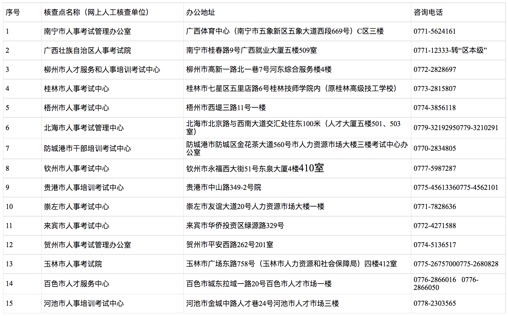 全區(qū)人事考試機(jī)構(gòu)(核查點(diǎn))地址及聯(lián)系方式如下:
